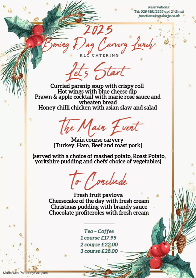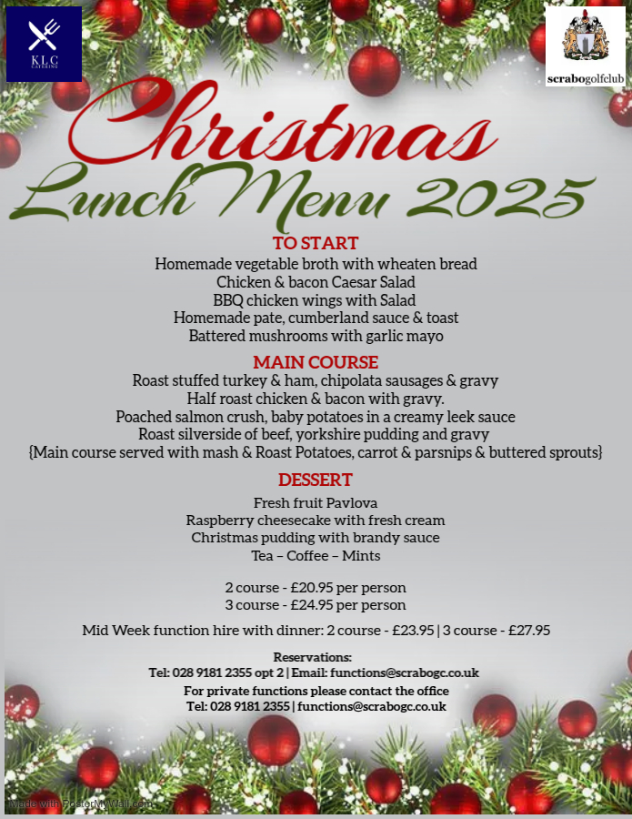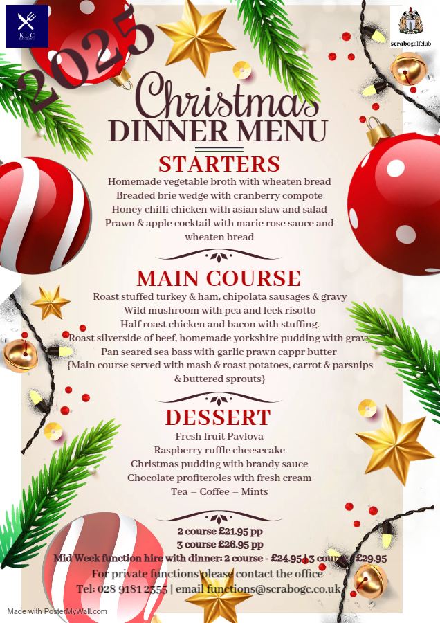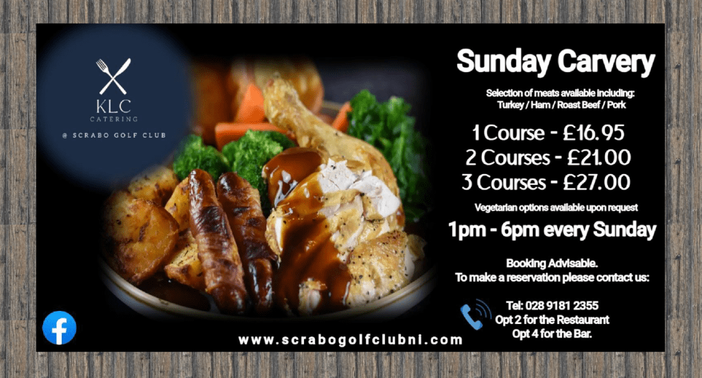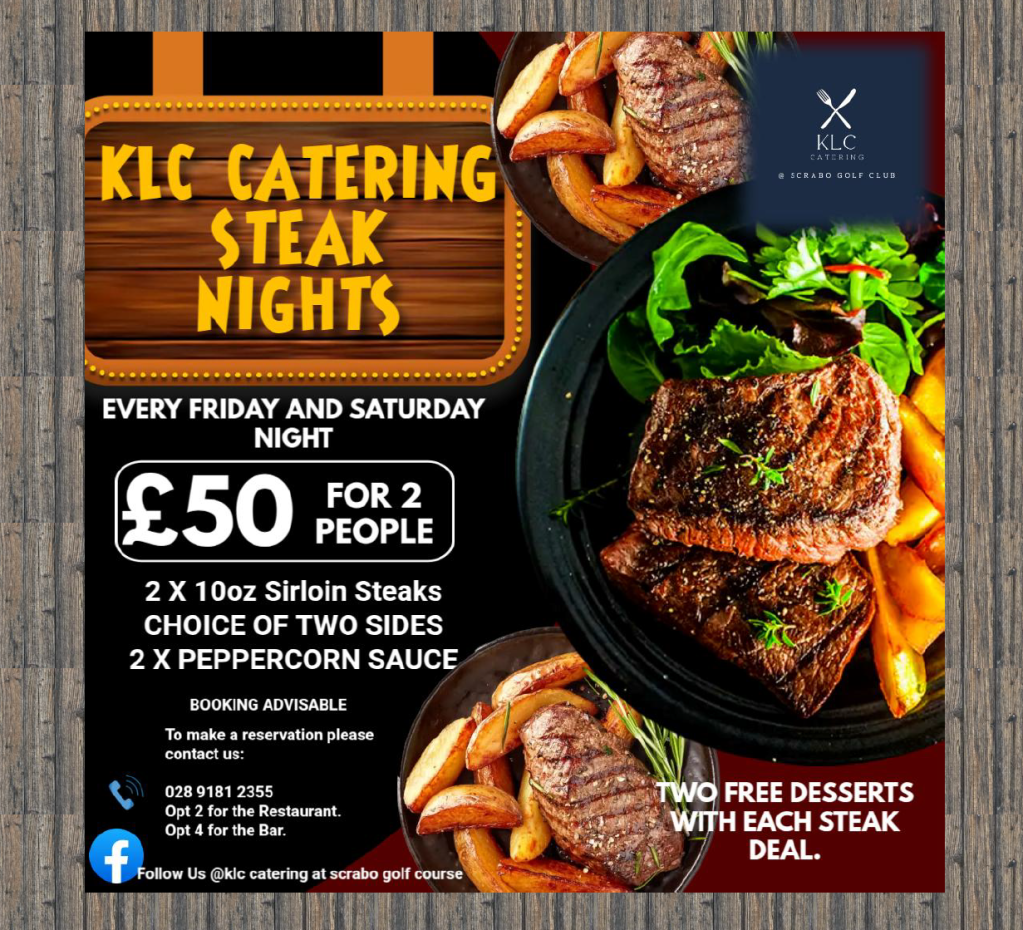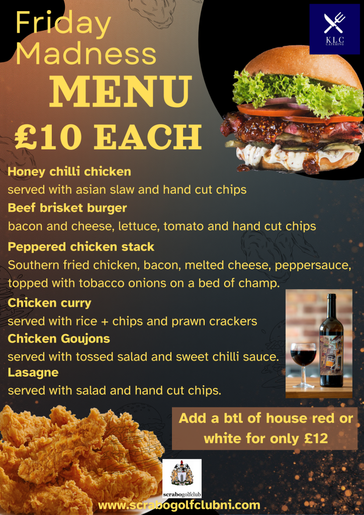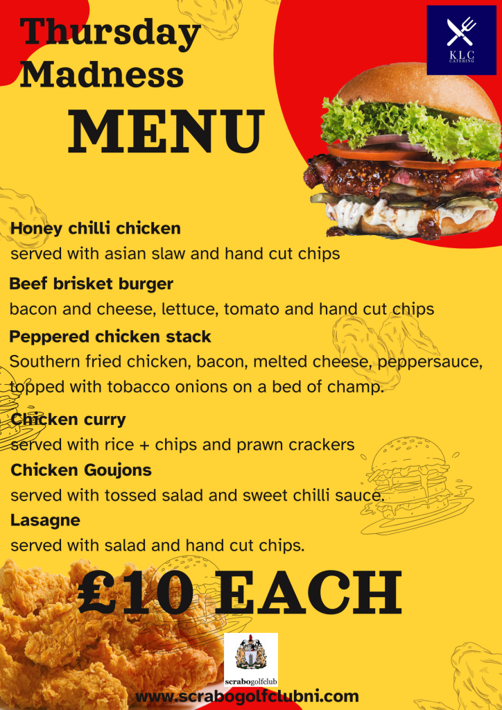 KLC CATERING We’re thrilled to welcome KLC Catering as the new catering franchise at Scrabo Golf Club! Current Opening Hours Mon: ClosedTues-Wed: 11am-3pmThurs-Fri: 11am-3pm / 5pm-9pmSat: 11am-9pm Sunday: 11am-7pm New Menu KLC Facebook Page